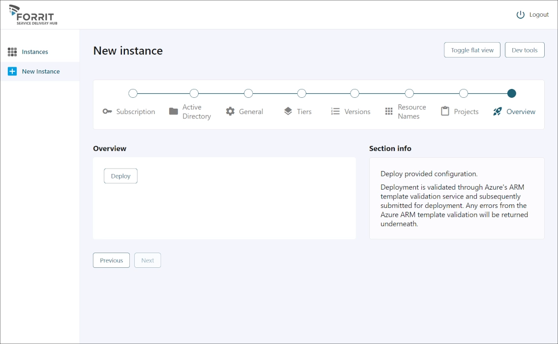 Le CMS Forrit est déployé et géré par le Service Delivery Hub, ce qui garantit que l’ensemble de l’environnement est créé avec précision. Le Hub fournit un tableau de bord consolidé pour surveiller et gérer l’ensemble de votre patrimoine Web. Il permet également la mise à l’échelle automatique des environnements selon les besoins et suit les coûts Azure en temps réel.